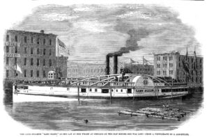 The PS (paddle steamer) Lady Elgin—a wooden-hulled sidewheel steamship—was built in 1851, and for nearly a decade it plied the waters of Lake Michigan, carrying passengers from Chicago to Milwaukee, as well as other Great Lakes ports. It had a dubious career, being involved in many accidents, which included striking a rock and sinking in 1854. Still, it persevered, until one fateful morning in 1860.