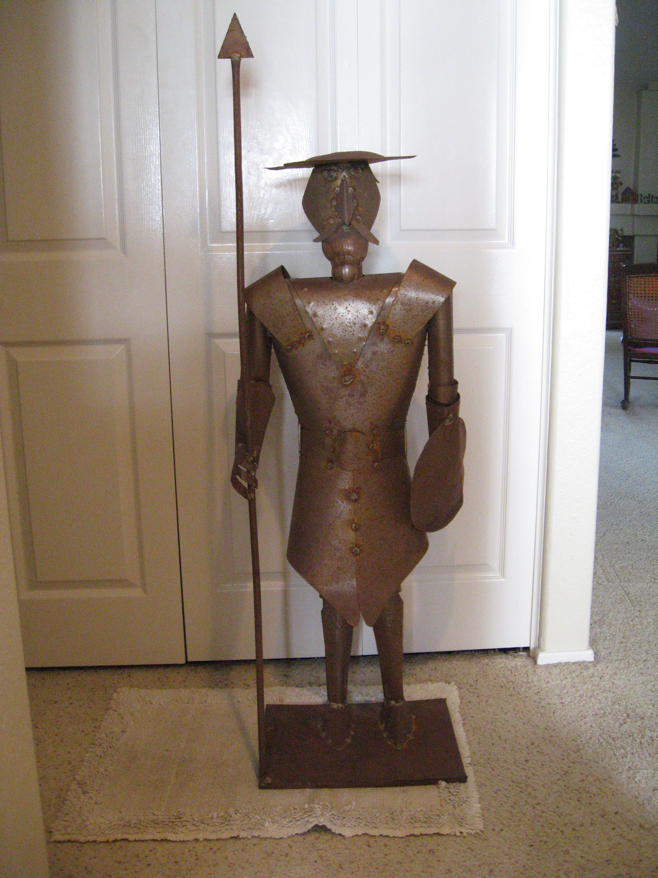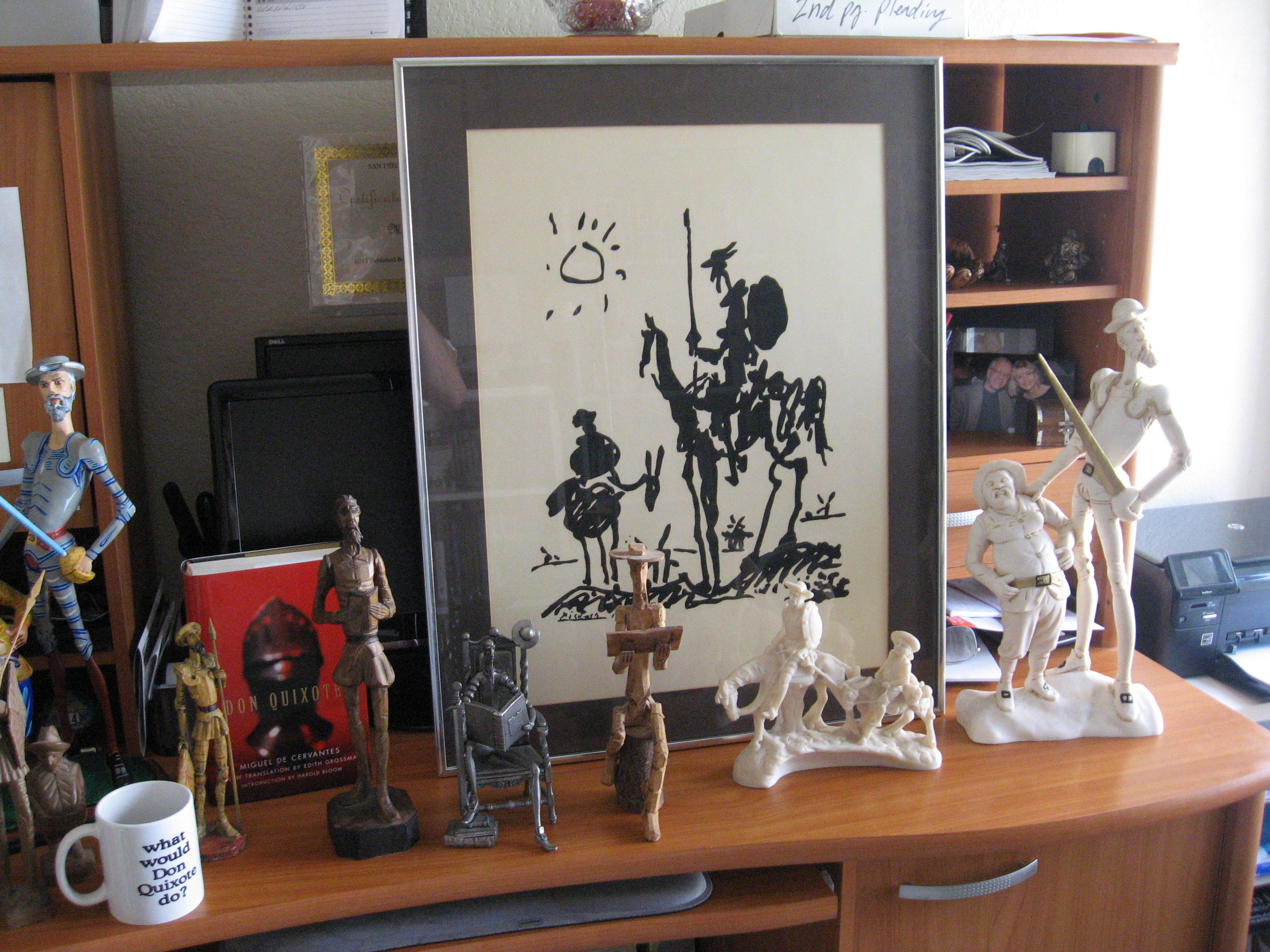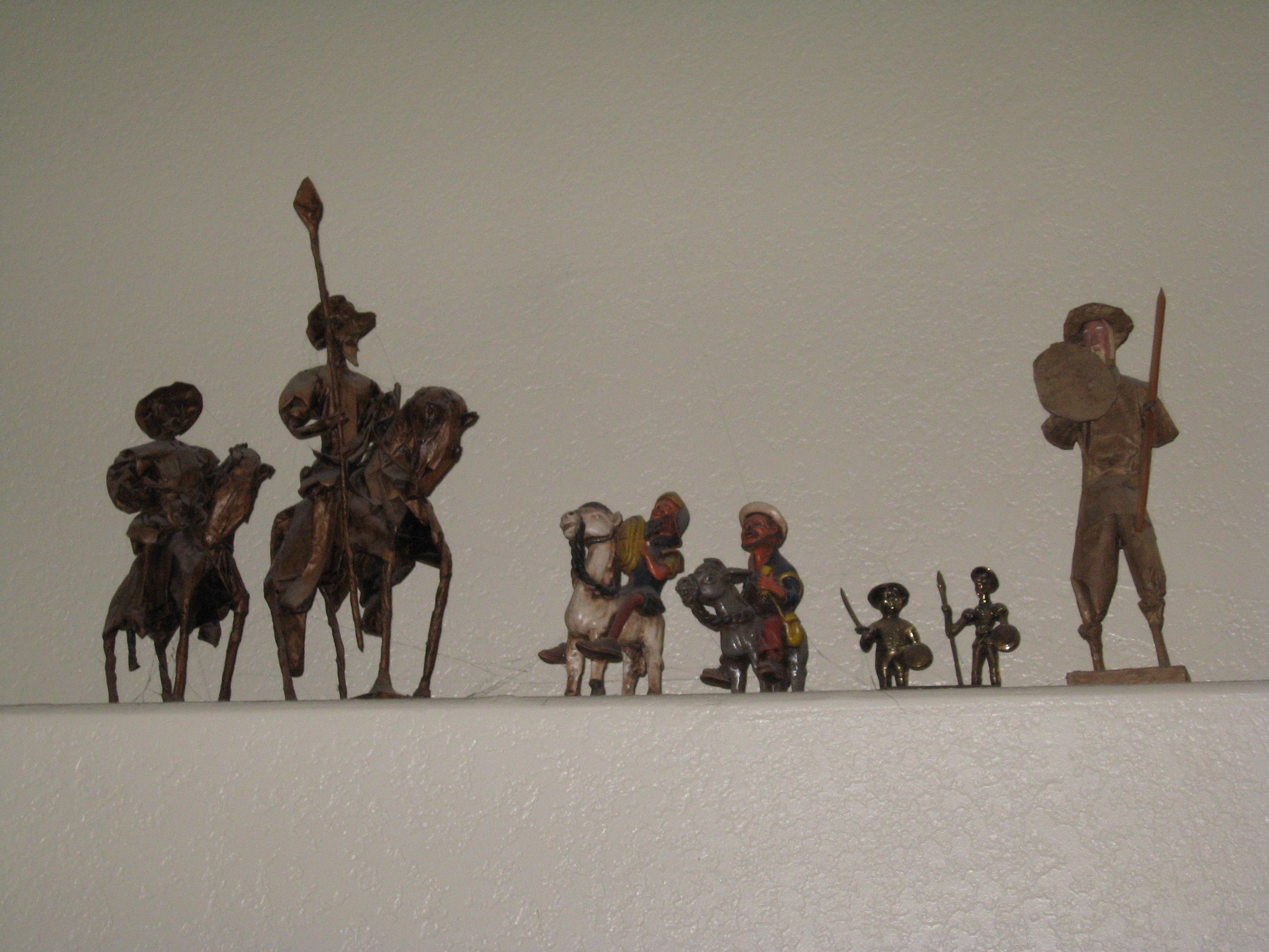 Scores of artifacts followed, some picked up during travels through Europe, Central and South America, and all over the U.S. Family and friends would bring pieces back with them. (I have a Don Quixote thimble, for crying out loud!) My wife, Jacqueline, got caught up in my DQ passion, and she freaked when we found a four-foot-tall sheet metal one at a flea market on a Native American pueblo in New Mexico. This DQ now welcomes visitors to our home.
